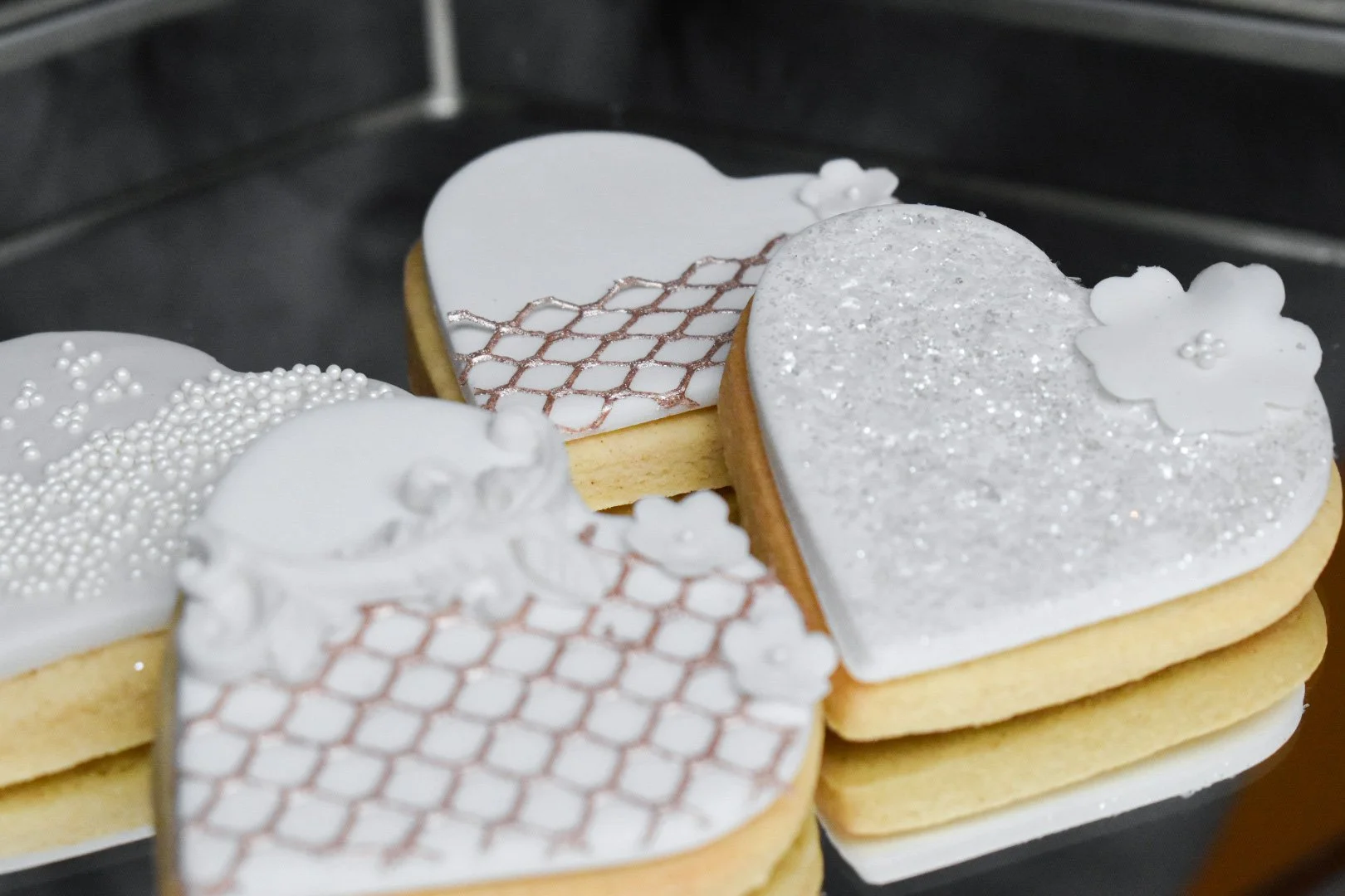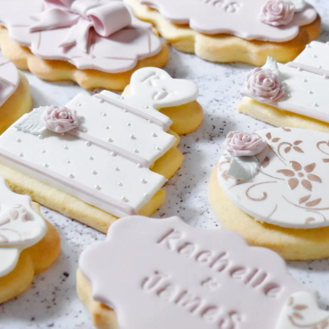 Similar to how a wedding cake can be custom-designed to match your vision, wedding favor biscuits can be personalised in a similar way. Their design can incorporate your chosen color, style, theme, and even a personalised message such as your names, initials and wedding date. Favour biscuits can also serve as place markers with each guest’s name or a keep sake for your guest’s to take home. The finishing touches for each biscuit can vary from modern to opulent, offering options like marble effects, gold or silver leaf, and edible pearls.